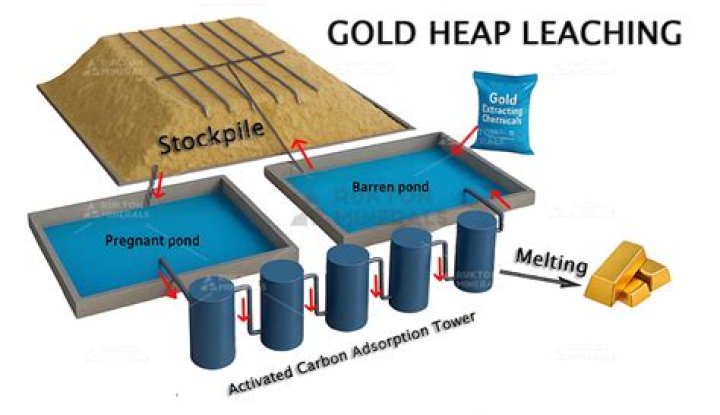 A sodium cyanide solution is commonly used to leach gold from ore. There are two types of leaching: Heap leaching: In the open, cyanide solution is sprayed over huge heaps of crushed ore spread atop giant collection pads. The cyanide dissolves the gold from the ore into the solution as it trickles through the heap.
