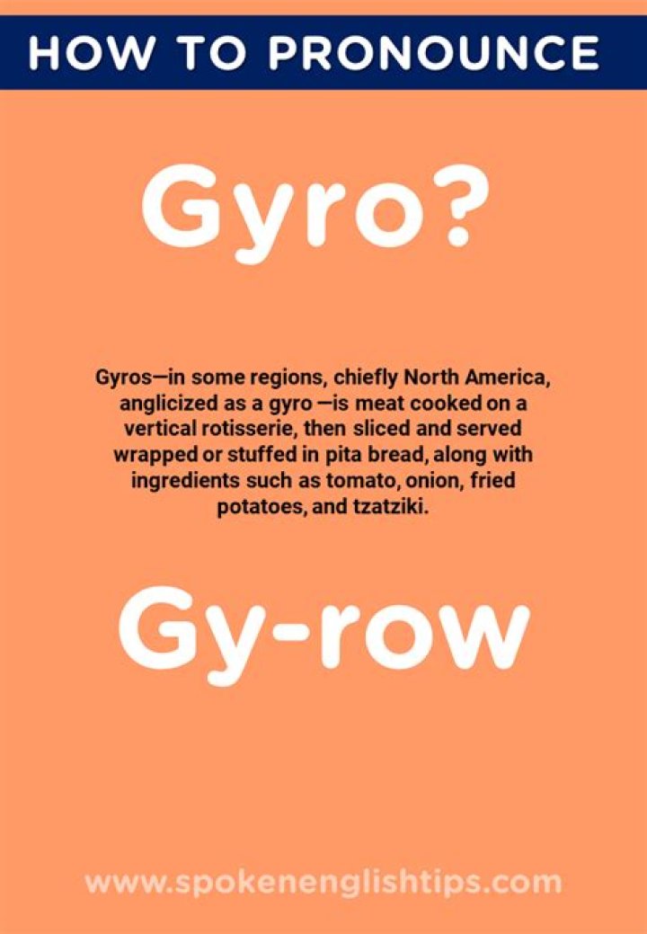 That gyro has two main pronunciations: /YEE-roh/ and /ZHIHR-oh/. The sandwich gyro was borrowed into English from Modern Greek in the 1970s and English speakers have given it an approximation of the Greek pronunciation. The earlier gyro has been fully phonetically anglicized.Is the G pronounced in gyro?