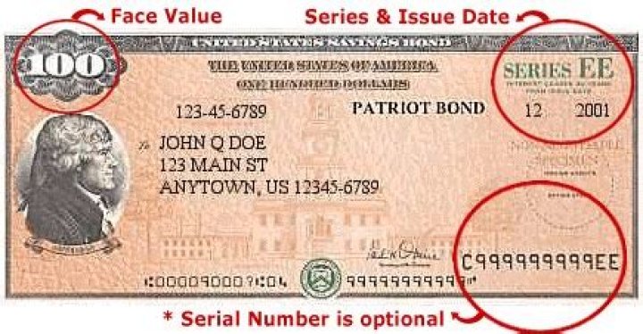 The series is located in the top right, with the issue date beneath it. The face value is in the upper left. The name and address of the buyer or recipient are below that. The bond’s serial number appears on the bottom right of the bond.