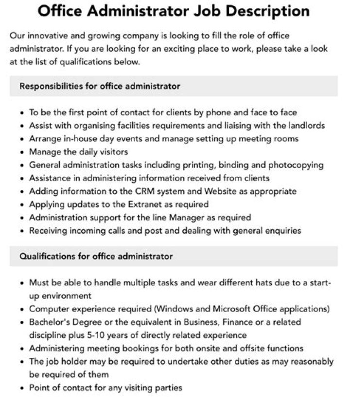 1 High school diploma or a Bachelor’s degree in business, administration, or a related field. 2 2 or more years’ office administration experience. 3 Proficient in a variety of computer software applications including Microsoft Office Suite (Word, Excel, Outlook, and Access). 4 Comfortable handling confidential information.