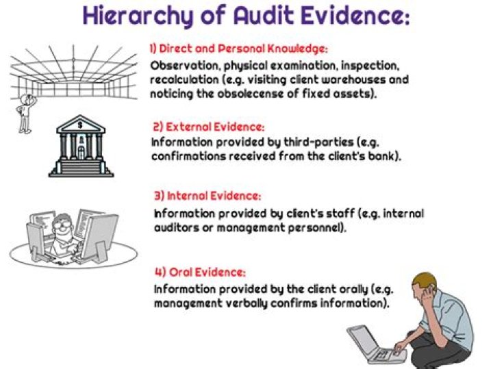 Internal sources of audit evidence include a company’s documented processes, policy documents, accounting records, invoices, system logs, and reports. External sources of audit evidence can include information from banks, debtors, suppliers, stock exchanges, and the Internal Revenue Service.