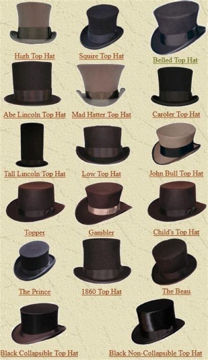 Also known as a beaver hat, a magician’s hat, or, in the case of the tallest examples, a stovepipe (or pipestove) hat. A tall, flat-crowned, cylindrical hat worn by men in the 19th and early 20th centuries, now worn only with morning dress or evening dress.