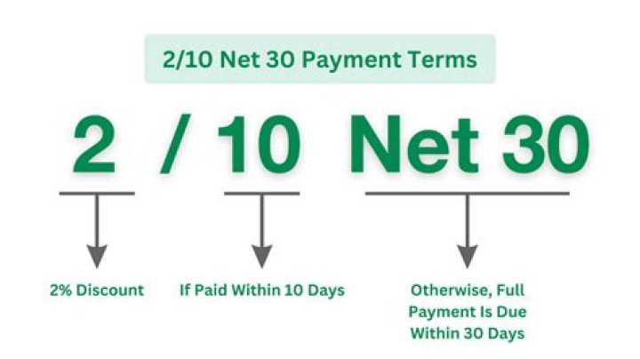 However, sellers also offer the credit term of 2/10 net 30, which means the buyer will receive a 2 percent discount on the balance owed if payment is made within ten days; otherwise, the full invoice balance is due in 30 days. Along the same lines, other variations of the 2/10 net 30 payment method include terms like 2/10 net 40 or 2/10 net 60.