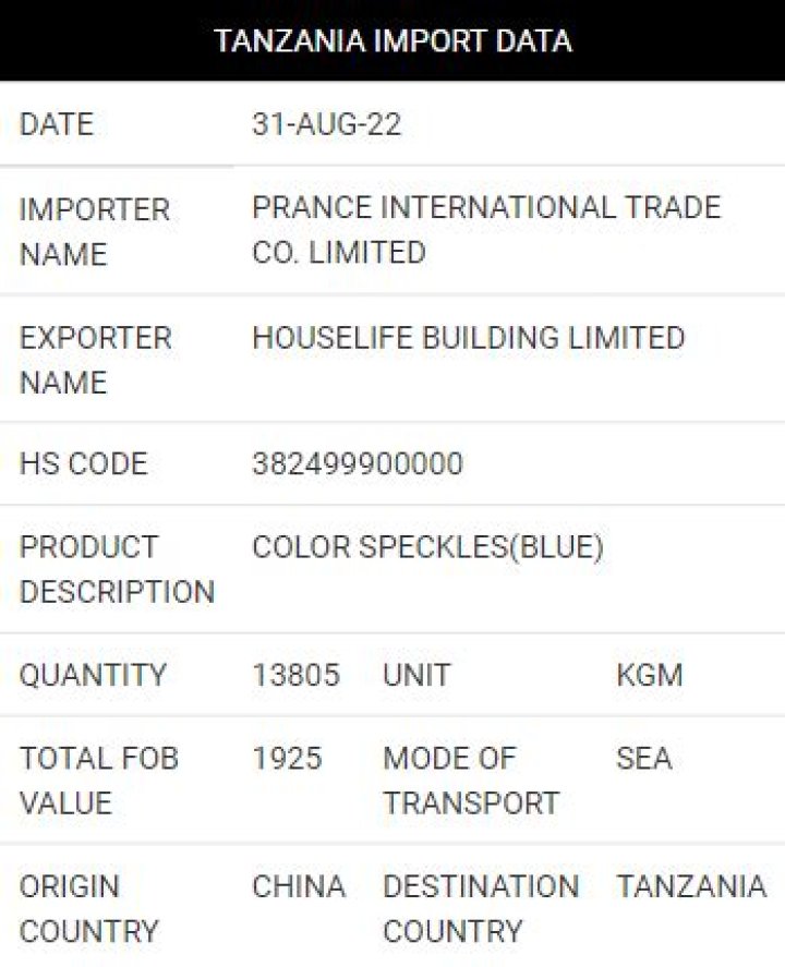 Tanzania import data covers Importer Name, Supplier Name, Destination Country, HS Code, Product Description, Quantity, Weight, Port and many more. Check out fields available in Tanzania trade data from a sample given.