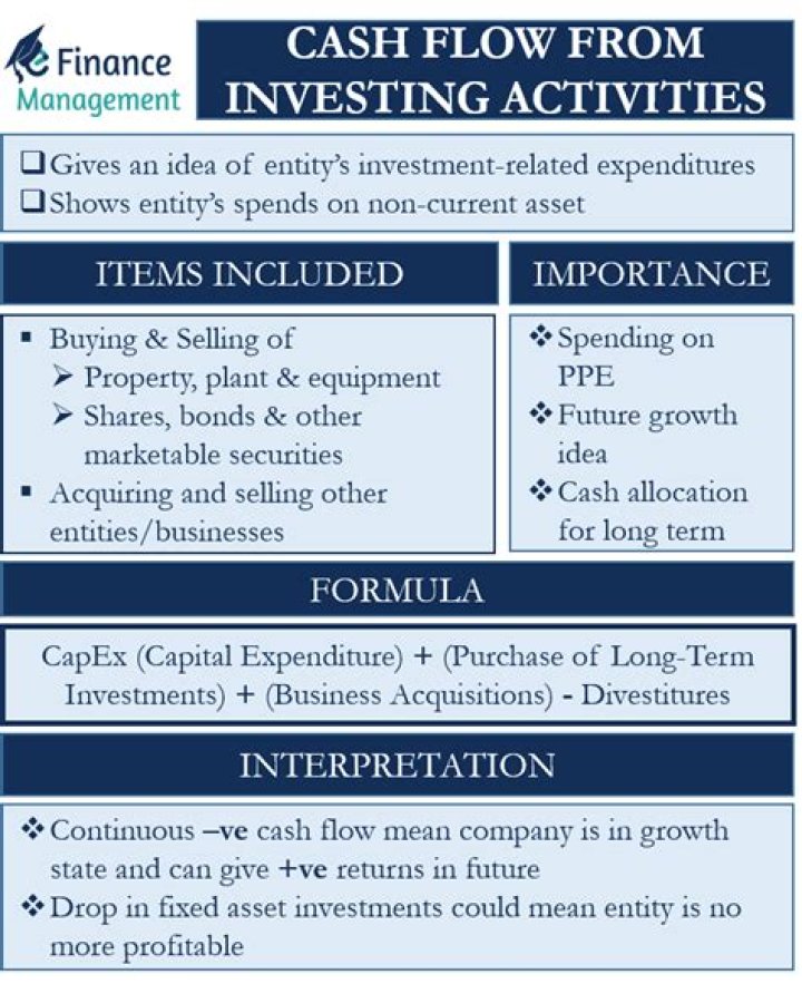 Sale of investment instruments, such as stocks and bonds (positive cash flow) Lending of money (negative cash flow) Collection of loans (positive cash flow) Proceeds of insurance settlements related to damaged fixed assets (positive cash flow)
