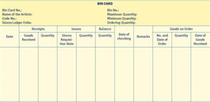 1. Bin card is the record maintained under the perpetual inventory system by the stores department and shows the quantities of materials received, issued and balance in hand after each receipt and issue. It is also known as stock card or bin tag. 2.