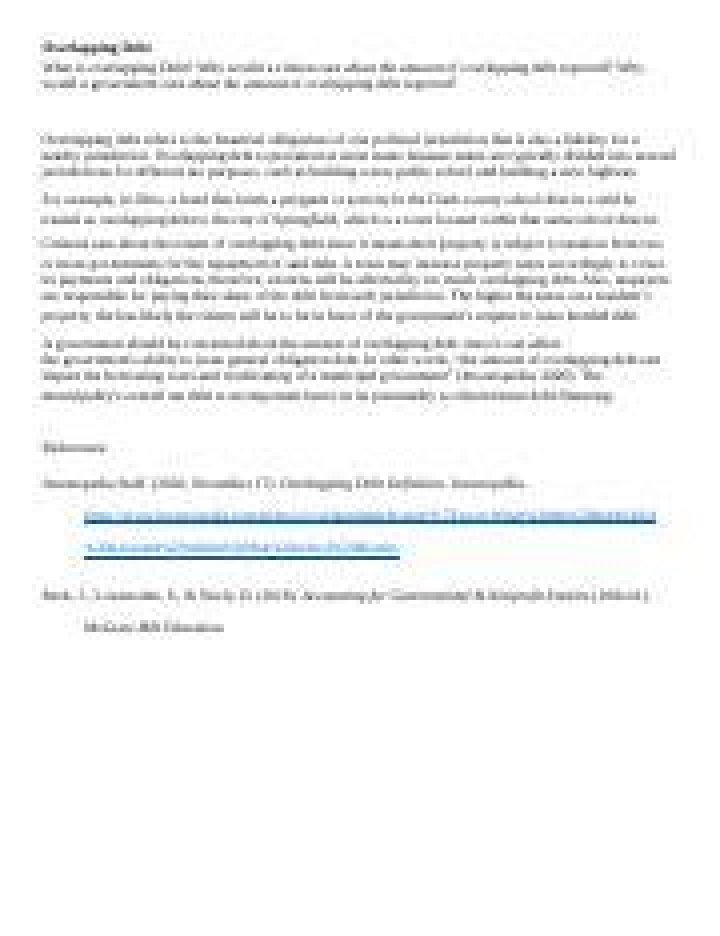 Overlapping debt refers to the financial obligations of one political jurisdiction that also falls partly on a nearby jurisdiction. Overlapping debt is common in the U.S. because most states are divided into numerous jurisdictions for different tax purposes, such as building a new public school or building a new road.
