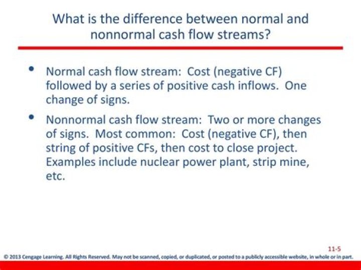 What is the difference between normal and nonnormal cash flow streams? Normal cash flow stream – Cost (negative CF) followed by a series of positive cash inflows. Nonnormal cash flow stream – Two or more changes of signs. Most common: Cost (negative CF), then string of positive CFs, then cost to close project.