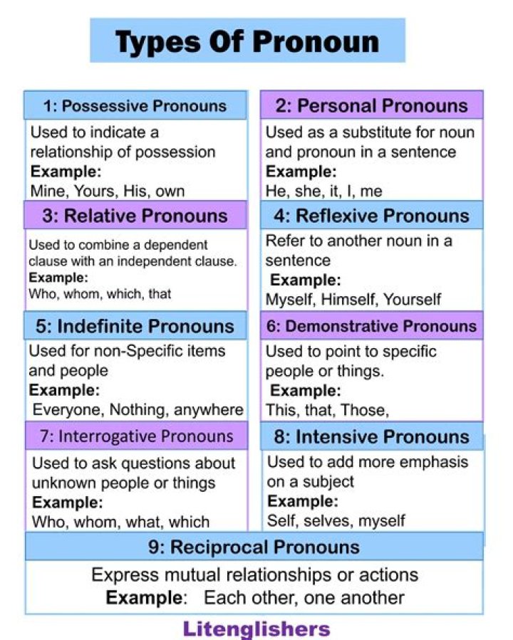 10 Types of Pronouns in Grammar. Personal Pronouns, Reflexive Pronouns, Emphatic Pronouns, Reciprocal Pronouns, Demonstrative Pronouns, Indefinite Pronouns, Interrogative Pronouns, Relative Pronouns, Distributive Pronouns, Exclamatory Pronouns.