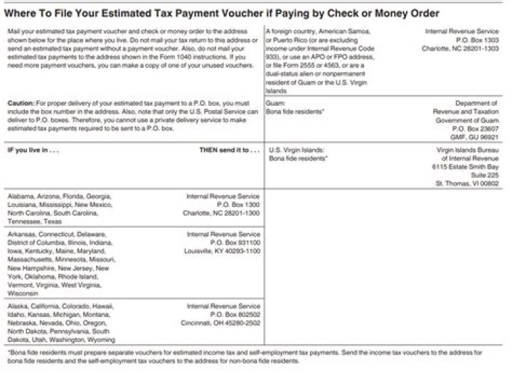 Mailing Address for Estimated Tax Payment (Form 1040-ES) The following group of people should mail their Form 1040- E.S. to the Internal Revenue Service, P.O. Box 1300, Charlotte, NC 28201- 1300 USA. People who are dual-status alien, or non-permanent resident of Guam, or the U.S. Virgin Islands.