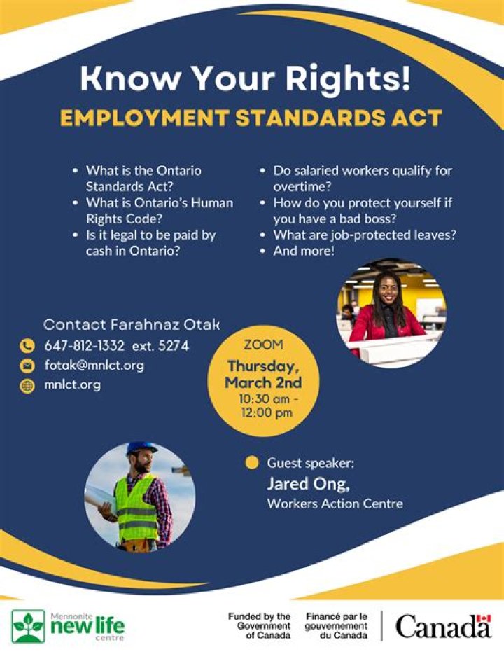 The Act covers a variety of work-related issues, including minimum pay, hours of work, time off, notice and severance pay upon termination, and other basic terms and conditions of employment. The Act is meant to provide minimum employment standards for employees.