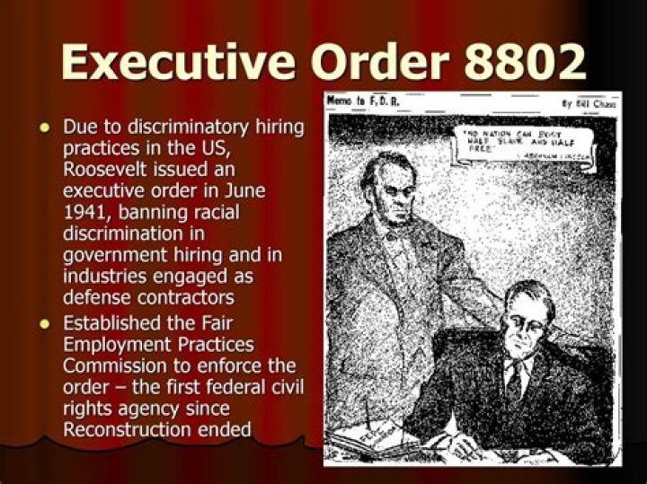 Citation: Executive Order 8802 dated June 25, 1941, General Records of the United States Government; Record Group 11; National Archives. How to use citation info. In June of 1941, President Roosevelt issued Executive Order 8802, banning discriminatory employment practices by Federal agencies and all unions and companies engaged in war-related work.